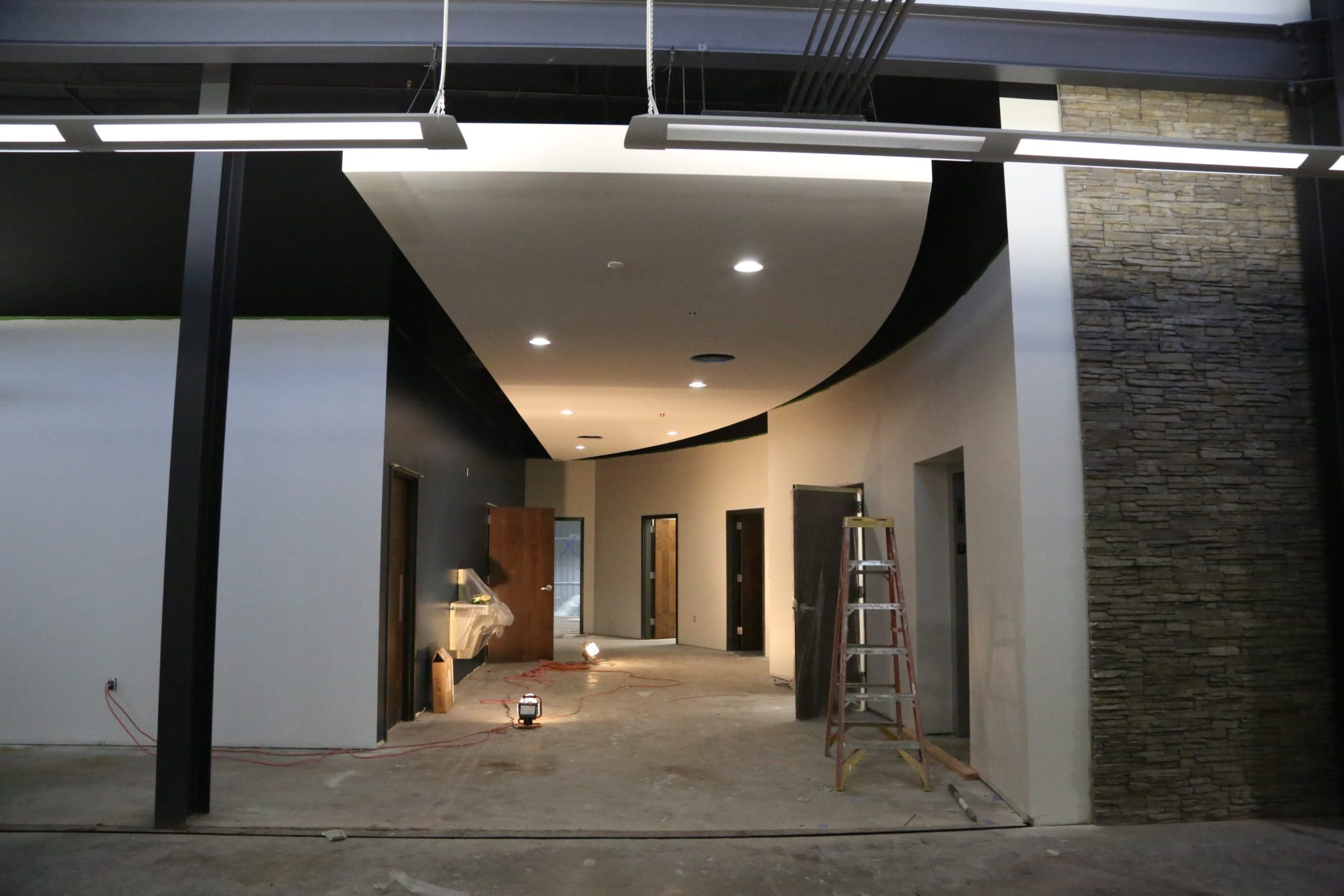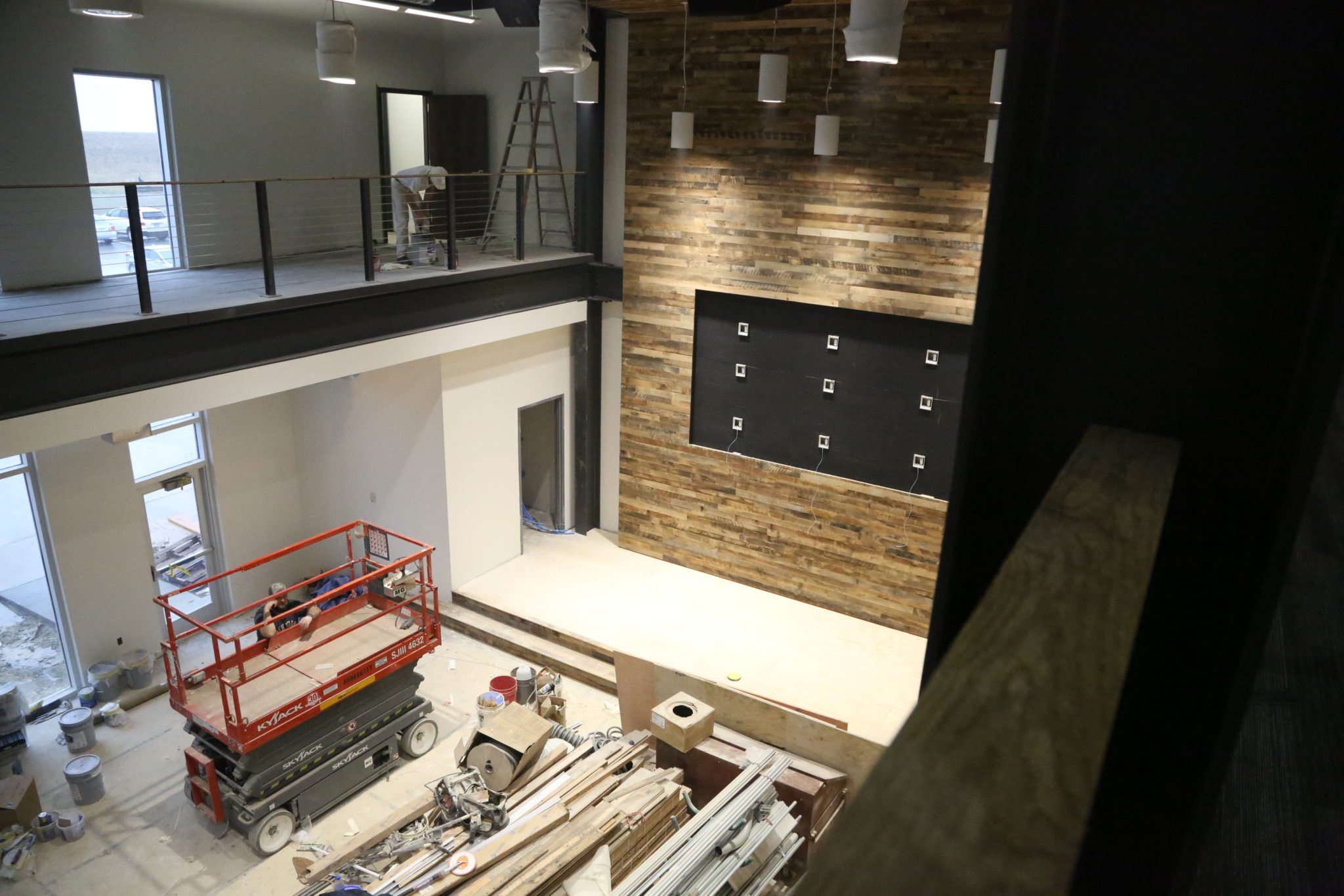 This is looking so cool, and is one of the things that I get excited to see finishing touches happen on during construction. As you can see, we have this cool wood plank around the TV wall on the stage. That wood has been tied into the steps leading up to the stage, the outside of the sky box, and the railing along the second floor.
