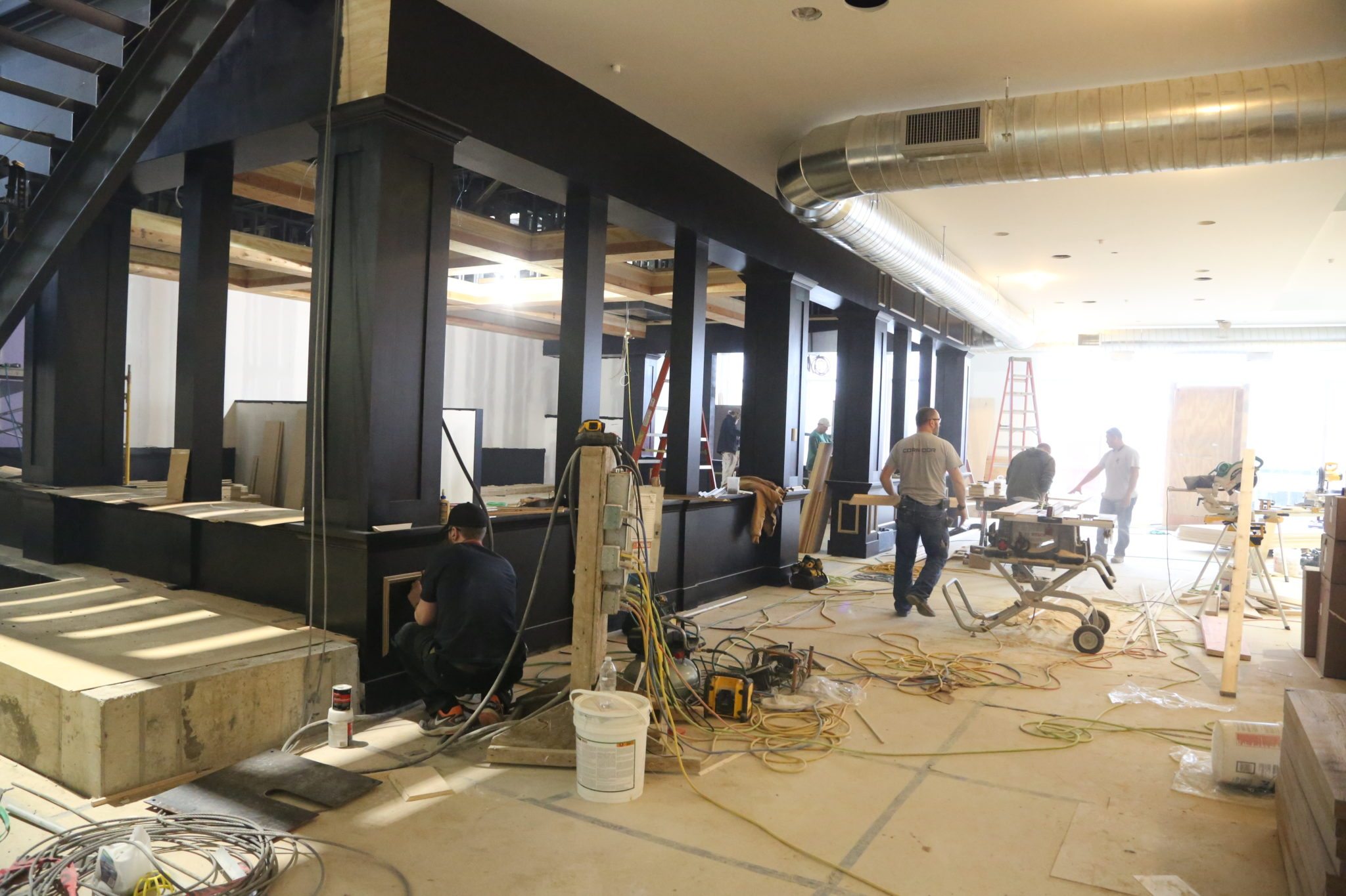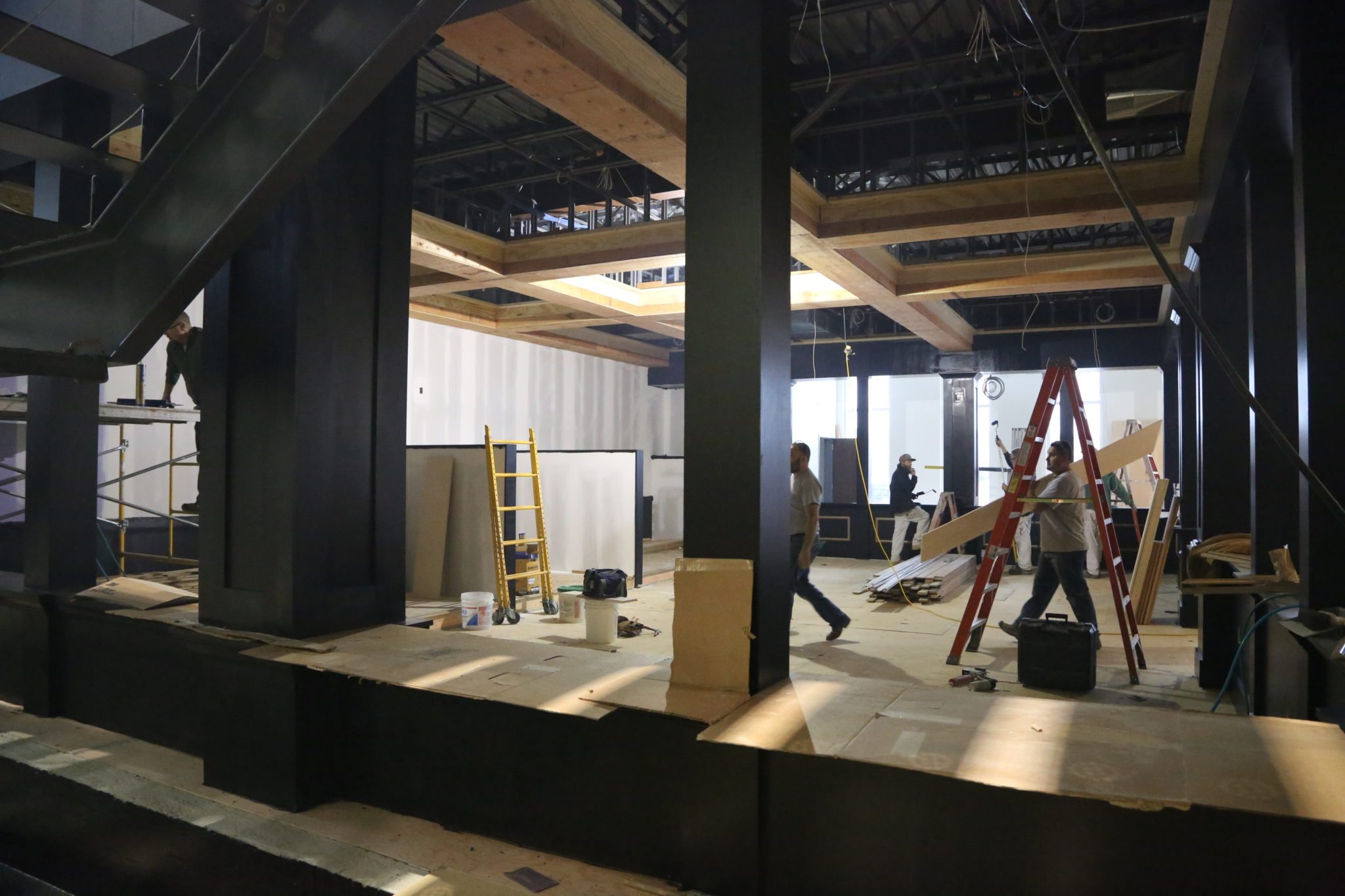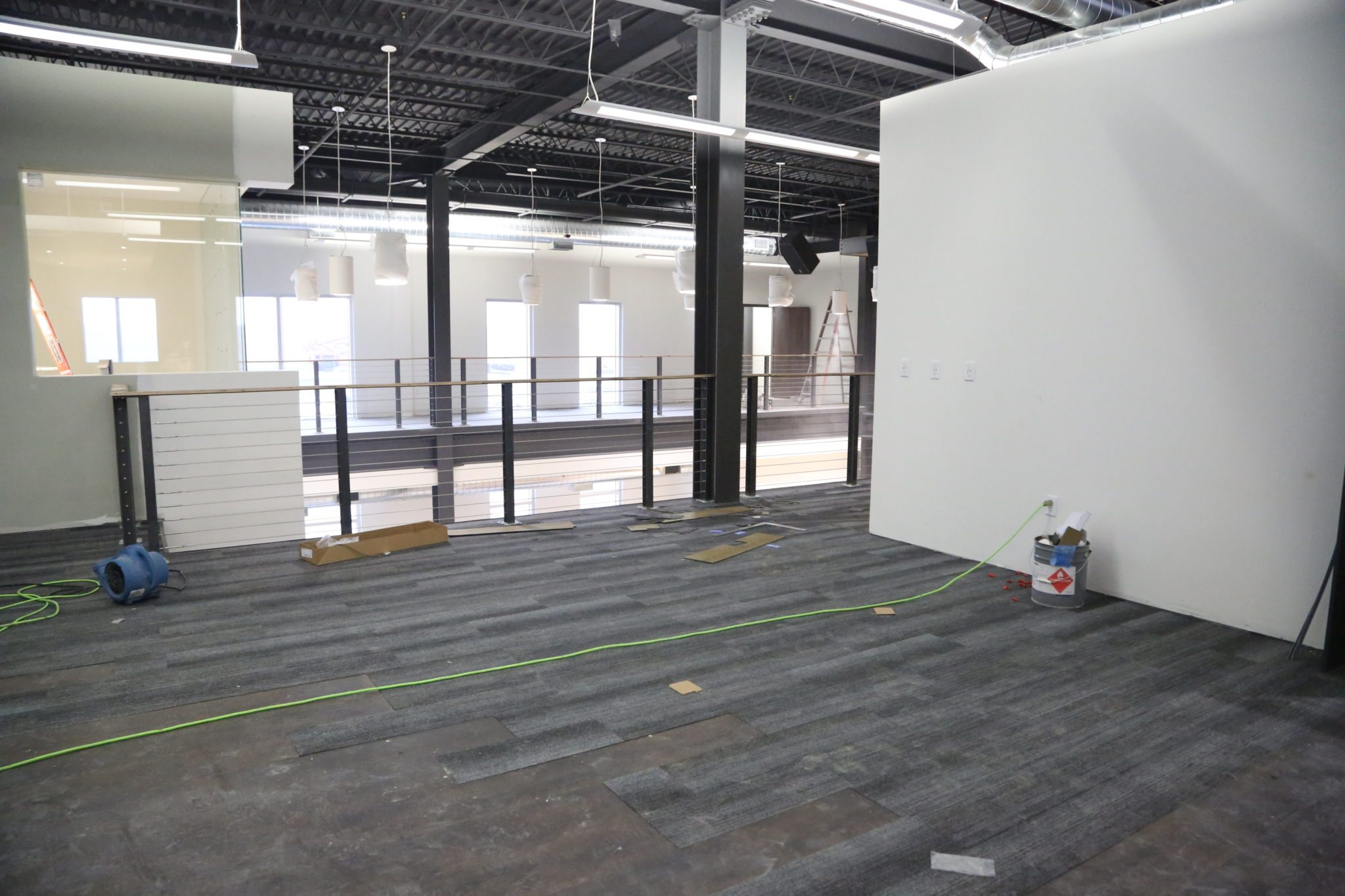This is looking so cool! At the end of our grand room, there will be a pub! If you look carefully, you can see where the booths will be going in along the back wall of the space. There will be windows all around, and a really dark, moody, atmosphere within. This will be a great space for socializing, eating lunch, or even to have team meetings. This is a really unique feature of the building we are excited about.