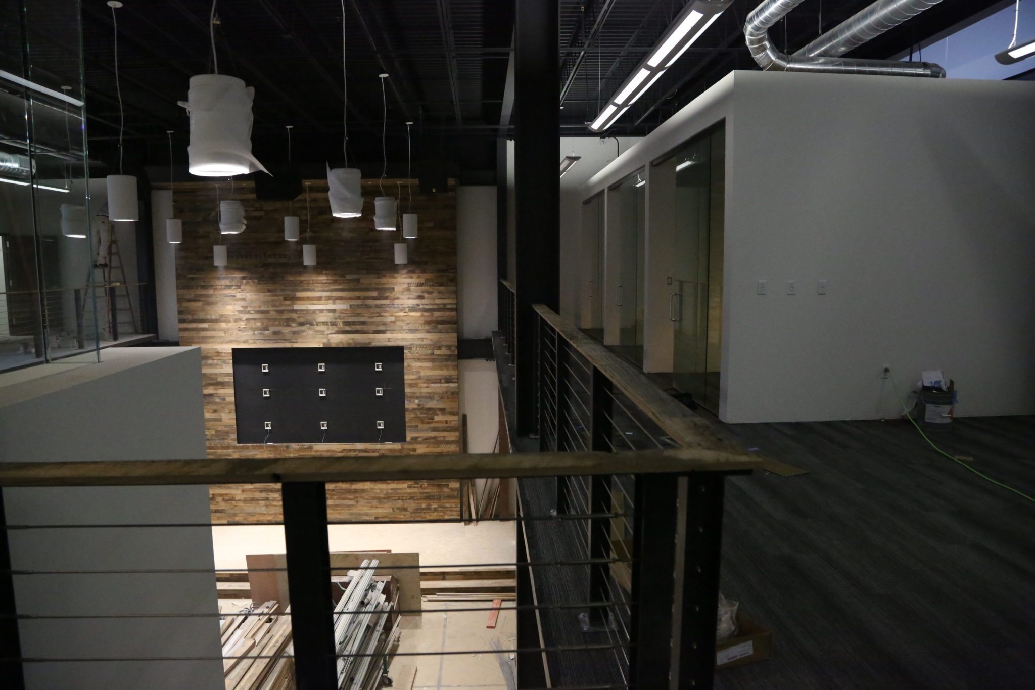 With that big wall of tvs, and the audio being wired throughout, employees will be able to sit upstairs or down on the main floor during meetings.