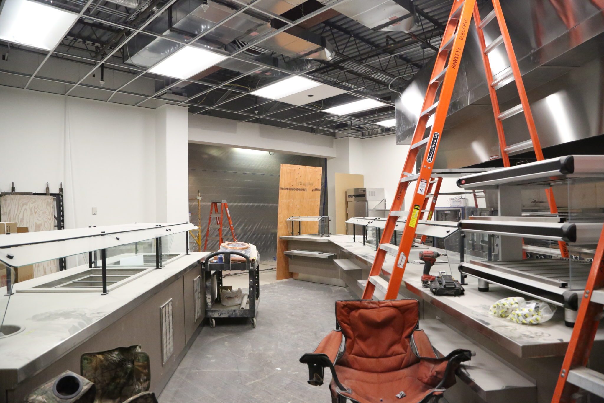 As you can see, the equipment is almost completely installed in the kitchen. Chef Zach is truly counting down the days to occupancy. On the left is the salad and soup bar, the right is the full service line, and if we were to do a 180, you would see the beverage bar, and a (healthy) dessert bar. This space will lead out to the grand room, or if you went through the brand new opening (that area in the center that is in plastic) you will be in our current bistro.