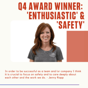 For her work in Q4, we are please to provide double honor to Jenny by recognizing her as our ‘Safety’ and ‘Enthusiastic’ award winner. Well done, Jenny!